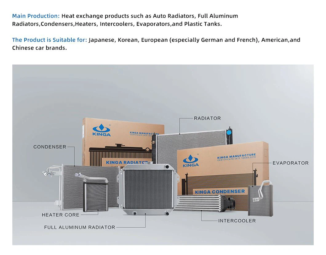 KINGA AUTO INDUSTRIAL CO., LTD fue fundada en 2003.It es un fabricante profesional especialmente dedicado a la investigación, desarrollo, producción y comercio global de radiadores de automóviles, condensadores, inter-enfriadores, calentadores y otras partes de automóviles del sistema de transferencia de calor