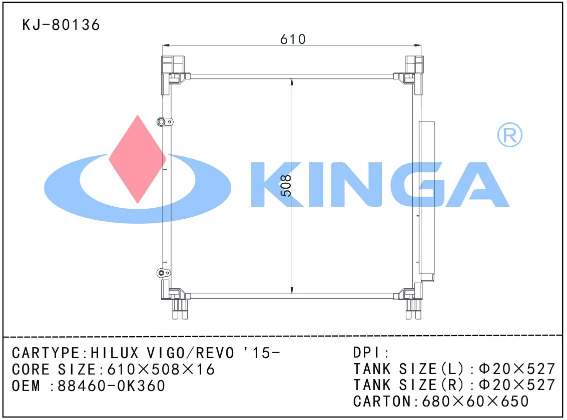 KINGA AUTO INDUSTRIAL CO.,LTD fue fundada en 2003. Es un fabricante profesional especialmente dedicado a la investigación, el desarrollo, la producción y el comercio mundial de radiadores, condensadores, interenfriadores, calentadores y otras piezas de automóviles del sistema de transferencia de calor.